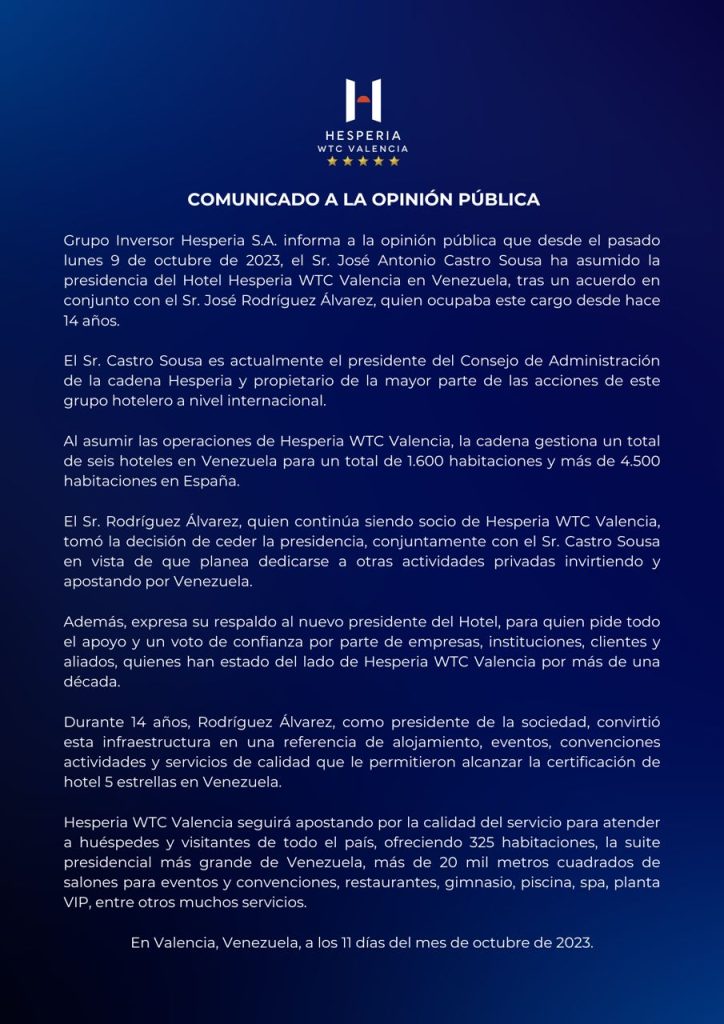 Grupo Inversor Hesperia S.A. informa a la opinión pública que desde el pasado lunes 9 de octubre de 2023, el Sr. José Antonio Castro Sousa ha asumido la presidencia del Hotel Hesperia WTC Valencia en Venezuela, tras un acuerdo en conjunto con el Sr. José Rodríguez Álvarez, quien ocupaba este cargo desde hace 14 años.